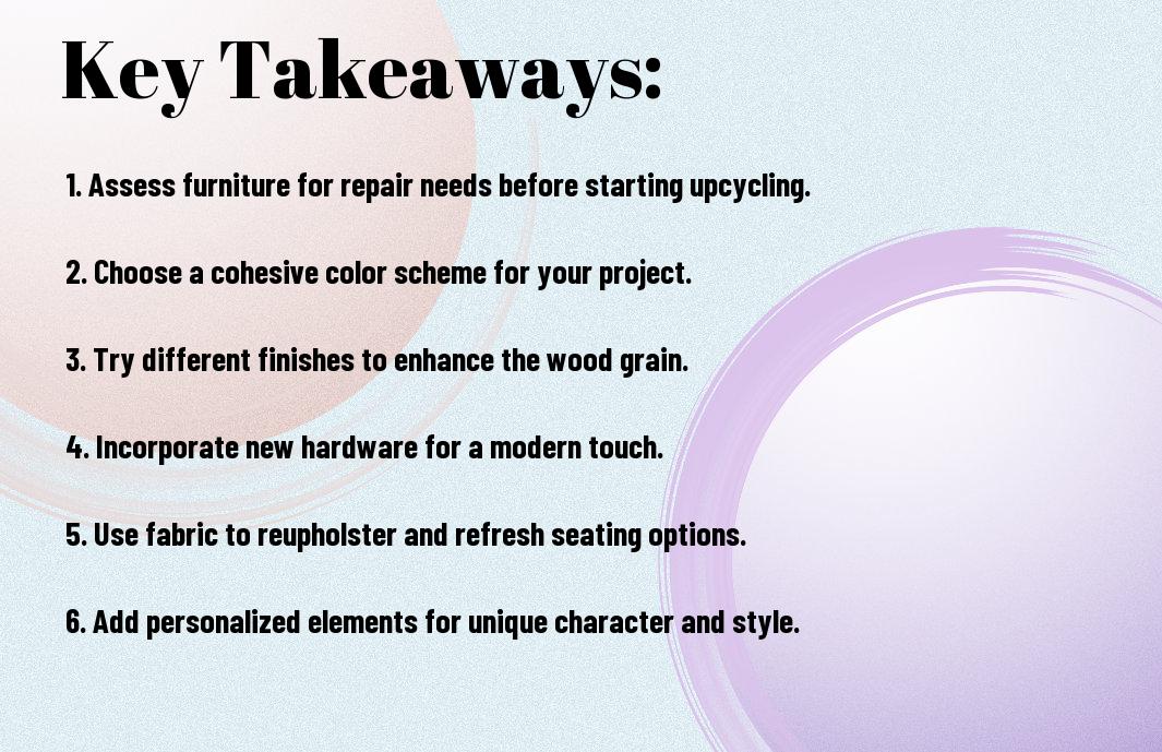 To transform your old furniture, start by assessing its condition and potential. You can repaint, reupholster, or refinish it to give it a new look that fits your needs.