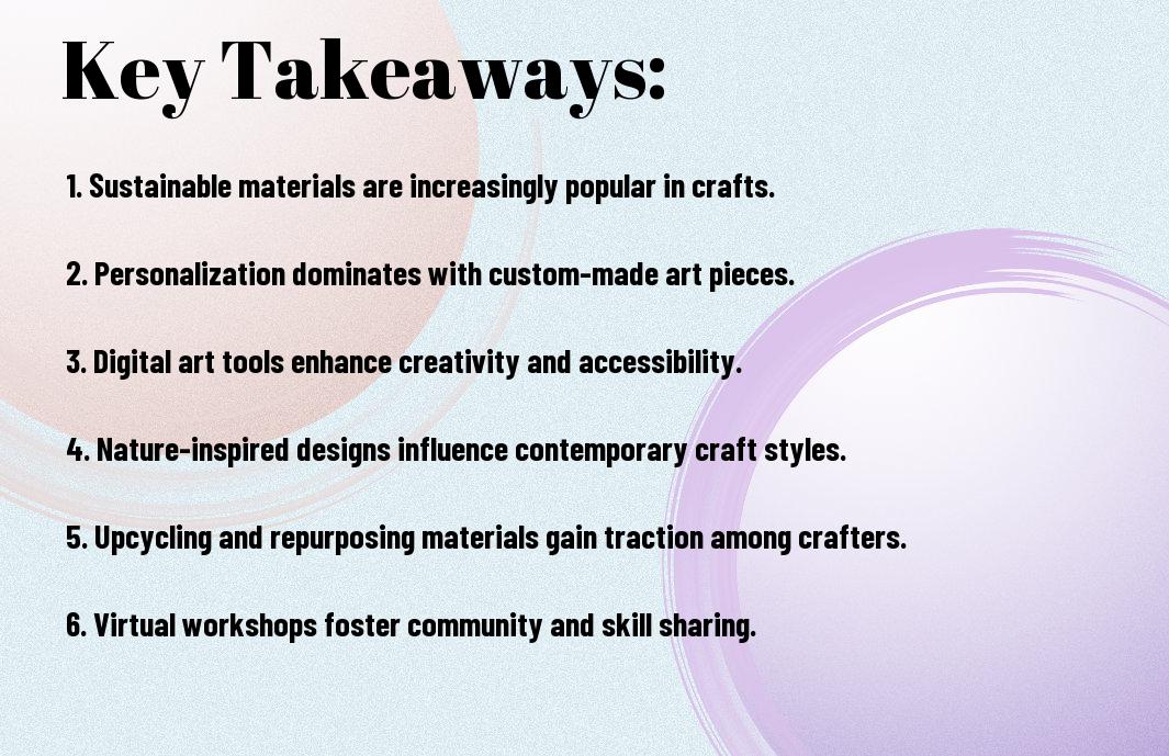 Upon reflecting on the top arts and crafts trends, you now have a better understanding of what to expect. You can explore your creativity with various styles and techniques, updating your skills and knowledge. Your artistic journey will be enriched by staying informed about the latest trends, allowing you to express yourself in innovative ways and bring your unique ideas to life.